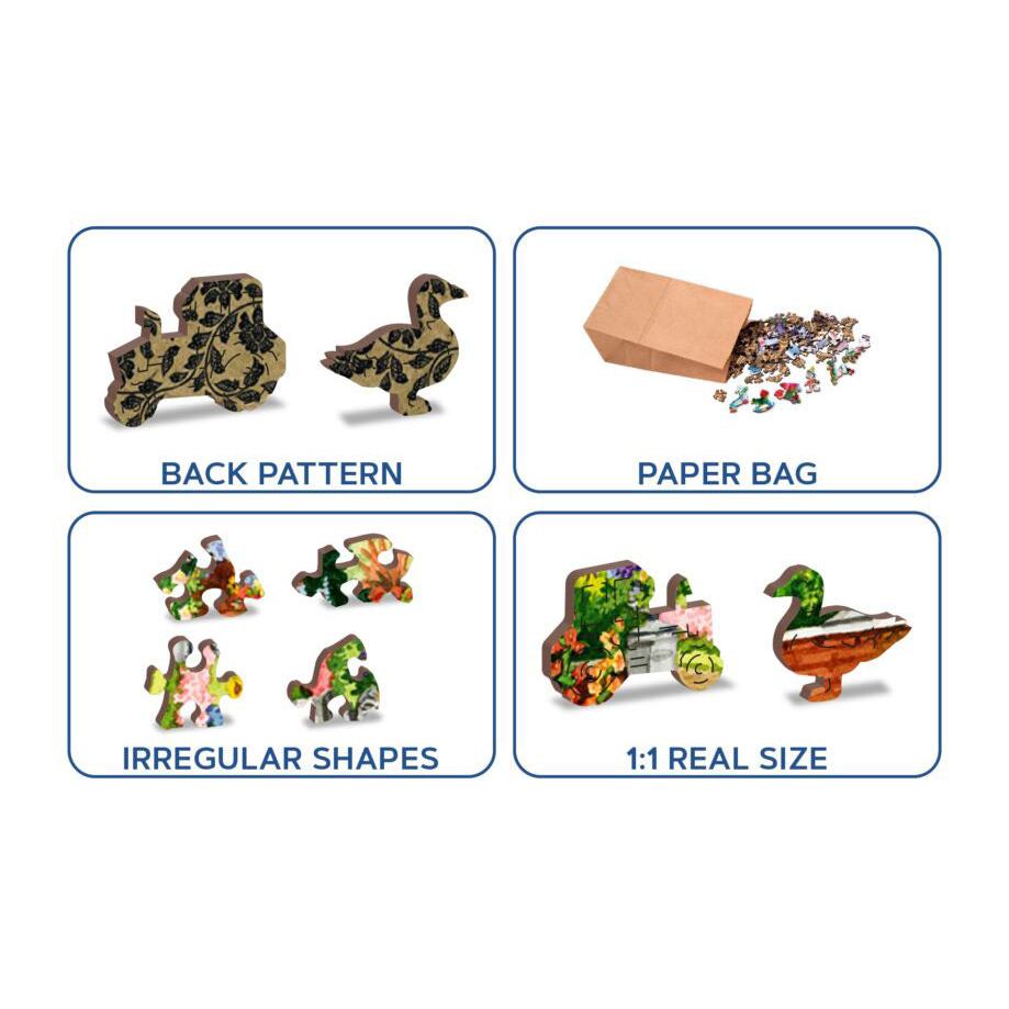 Each puzzle contains numerous unique shapes, characters, figures, and symbols that are cut seamlessly into the pattern. Think of these as mysterious little surprises each puzzle experience offers. These puzzles offer a high quality, rich beautiful image on the front and a detailed wallpaper style pattern on the back. Wooden City double-sided wooden puzzles offer a unique building experience that is sure to captivate puzzle enthusiasts of all ages.