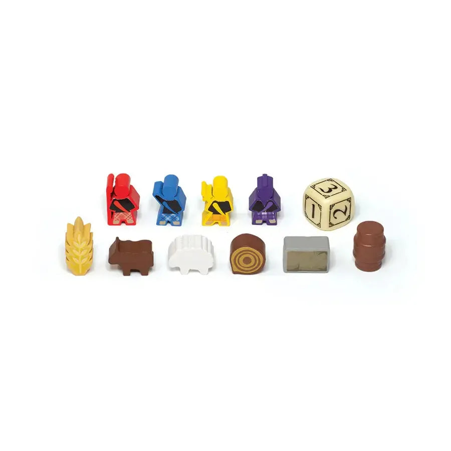 Includes: Rulebook, 2 game boards, 40 Player Pieces, 250 cardboard markers, (Clan Marker, Coins, Victoria Point Tokens, Clan Shields, Boat Race Markers, Penny Markers, Mobster Tokens Haggis Tokens, Voting Marker, England Marker), 90 Wooden Resources, 1 Die, 8 Chronicle Boxes, 25 Whisky Casks, 4 Home Territory Tiles, 2 NPC River Tiles, 4 Boats, 1 Market Overlay, 1 Mountain, 102 Tiles, 3 Sticker Sheets, 83 Cards - that's it. This game box is 7.15 lbs !