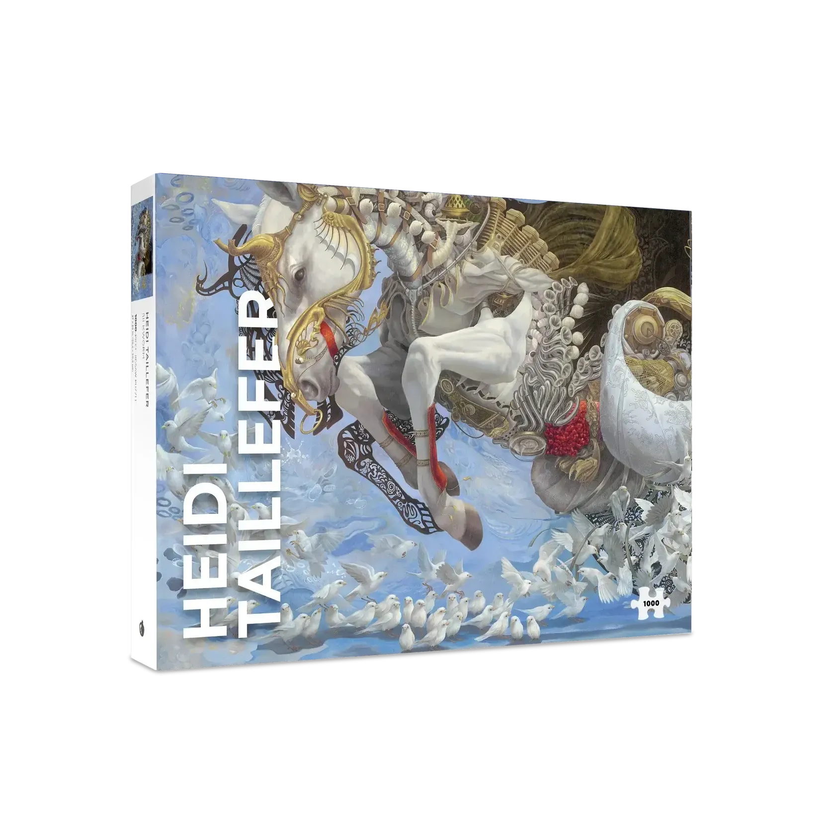 With a mighty leap, a soul enters the afterlife, as imagined by artist Heidi Taillefer. Silkworm explores the dualities of life and death, light and dark, nature and technology. The ethereal work—a reverie that diffuses elements of varied world religions, mythologies, and cultures, as so much of Taillefer’s figurative surrealist art does—grounds itself through its details, from the finely wrought tracery inspired by Indonesian shadow puppets to its title, an allusion to an Eastern folktale. Here, Taillefer’s white birds not only carry messages of peace and protection, freedom and hope, they also usher the spirit on to whatever lies next.