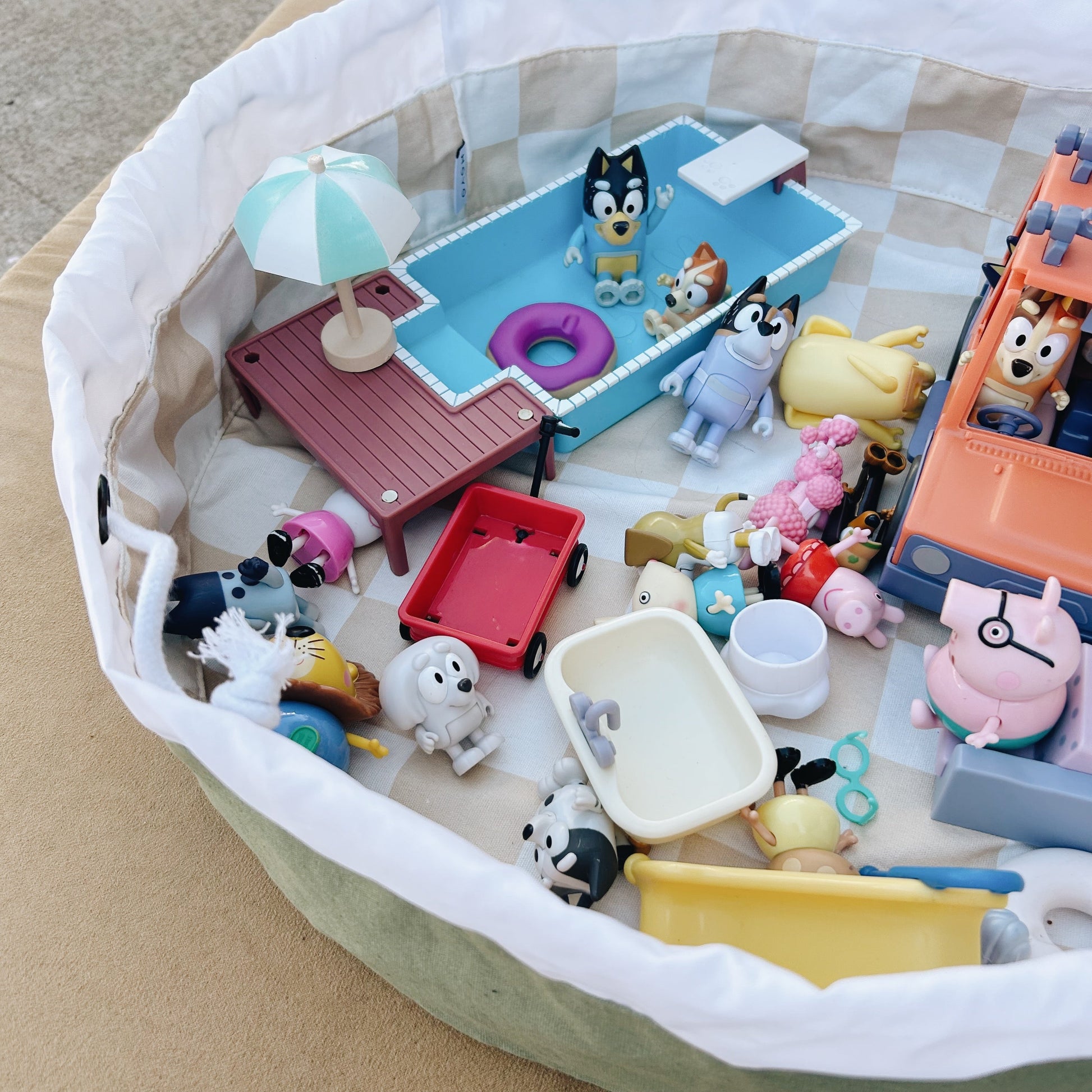 The cinch is a beautiful and flexible storage solution. Simply place your items on the circular base and pull the cording to cinch it up! Then hang it or place it wherever you please! The possibilities are endless but some of our favorite things to store in the Cinch are legos, magnatiles, barbies, or even sensory play fillers!