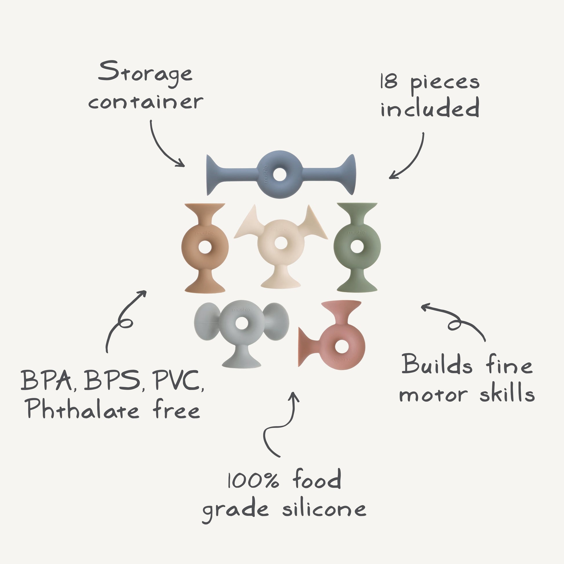 Unleash creativity and fun with this set of 18 silicone suction builder toys. Made from flexible, non-toxic silicone, the pieces easily connect, stack, and stick to smooth surfaces for a versatile toy during play time or bath time. Ideal for fostering motor skills and spatial awareness with endless opportunities to explore and create. When playtime is over, they neatly store away in a reusable storage container that keeps everything organized and ready for the next creation.