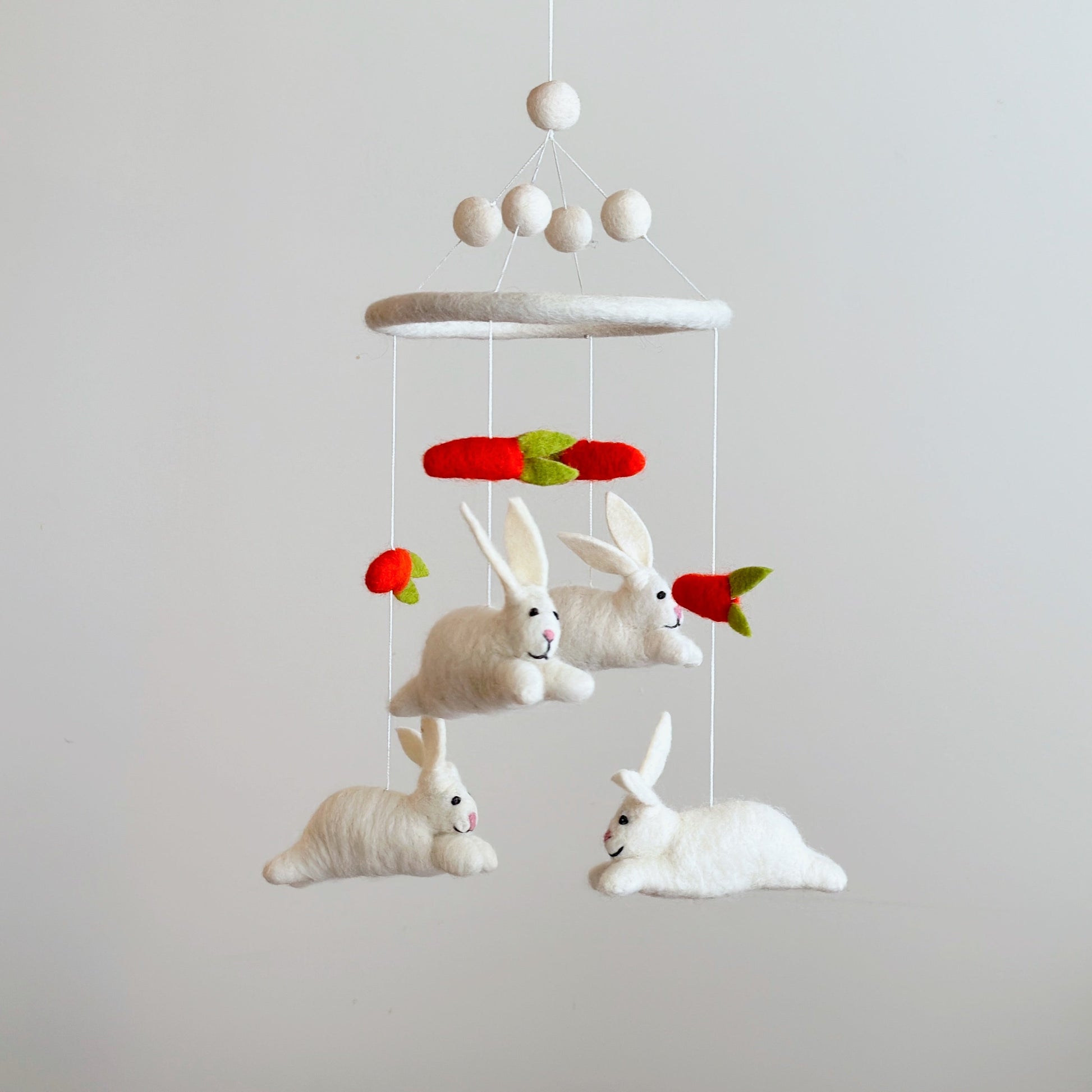 Introducing the Bunny Chasing Carrot felt Baby Mobile: a whimsical wonderland for your little one's nursery. With a fluffy bunny in hot pursuit of a vibrant carrot, this handcrafted mobile spins and plays a soothing melody. Stimulating the senses and sparking imagination, it's a charming addition to any baby's world.