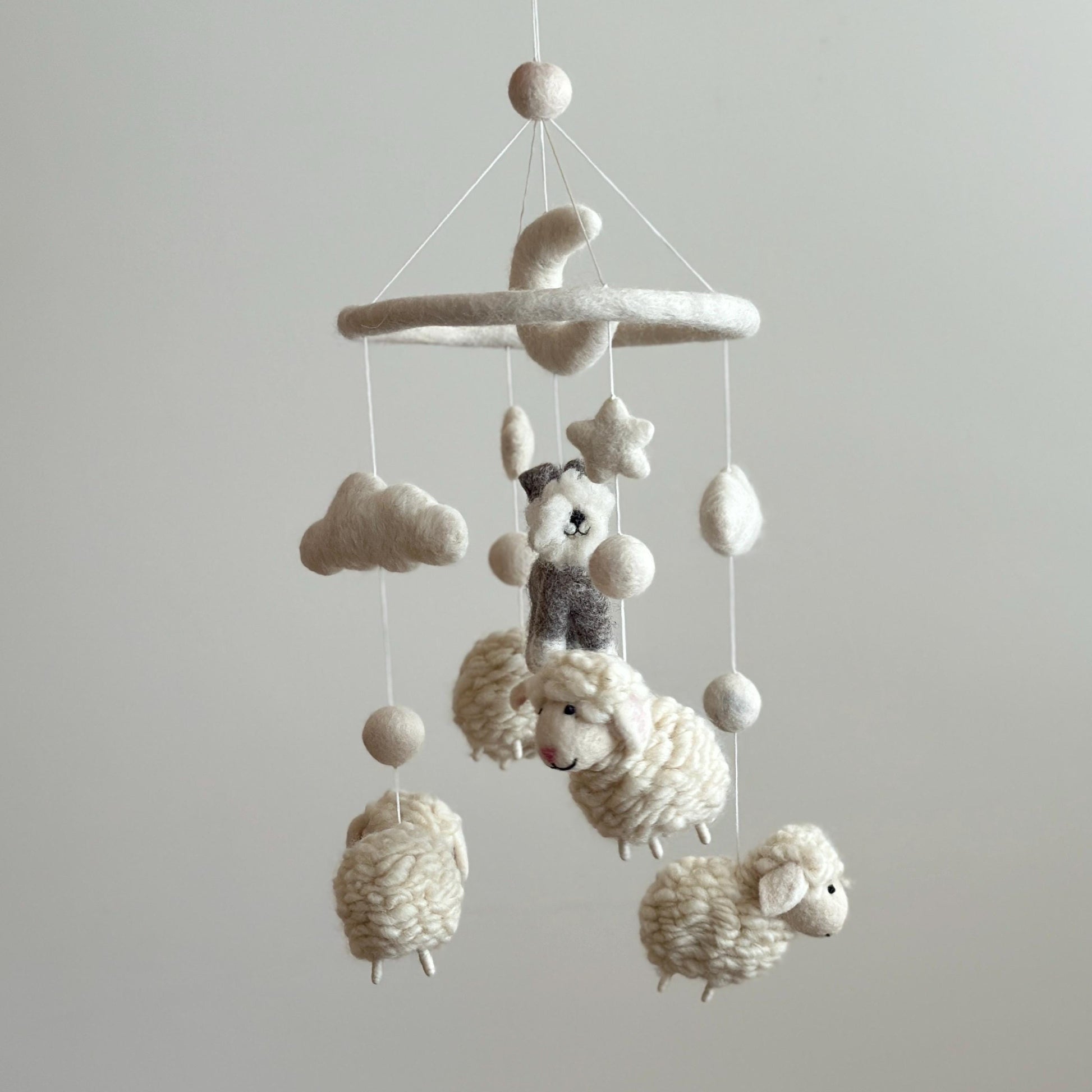 Our felt sheep baby mobile is hand-made in Nepal of 100% New Zealand wool and each figure is needle felted individually. The figure is in 3D and designed to look great at any angle.