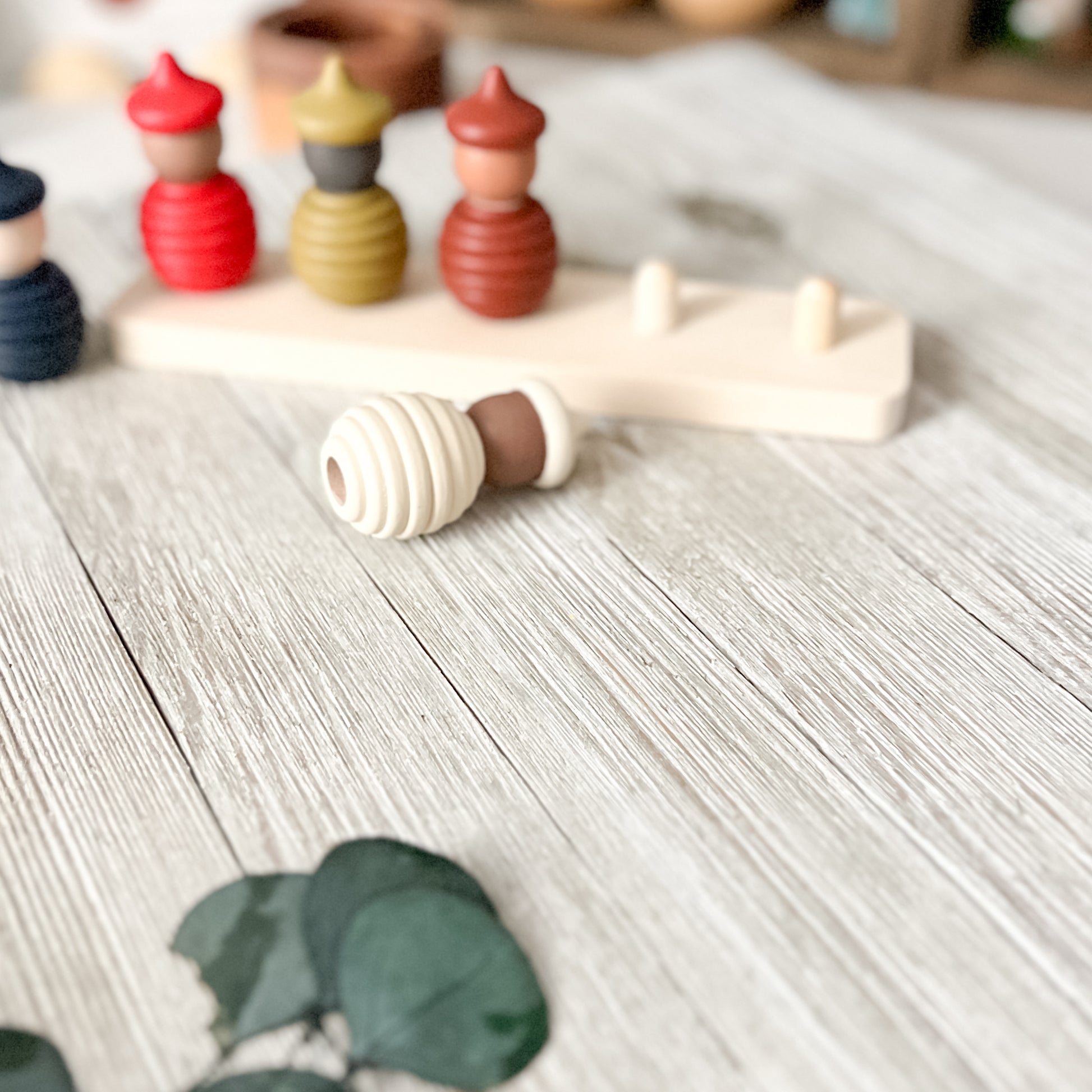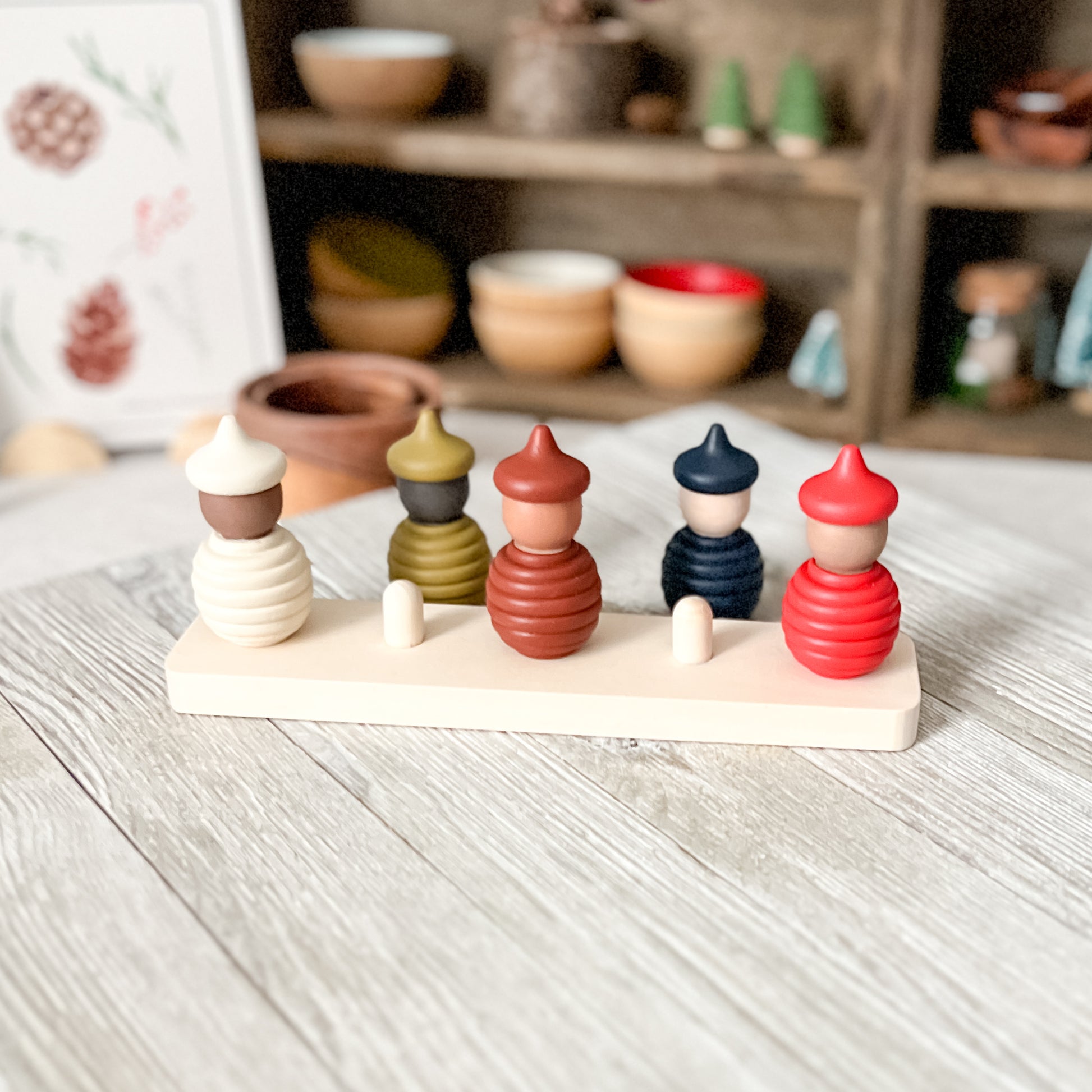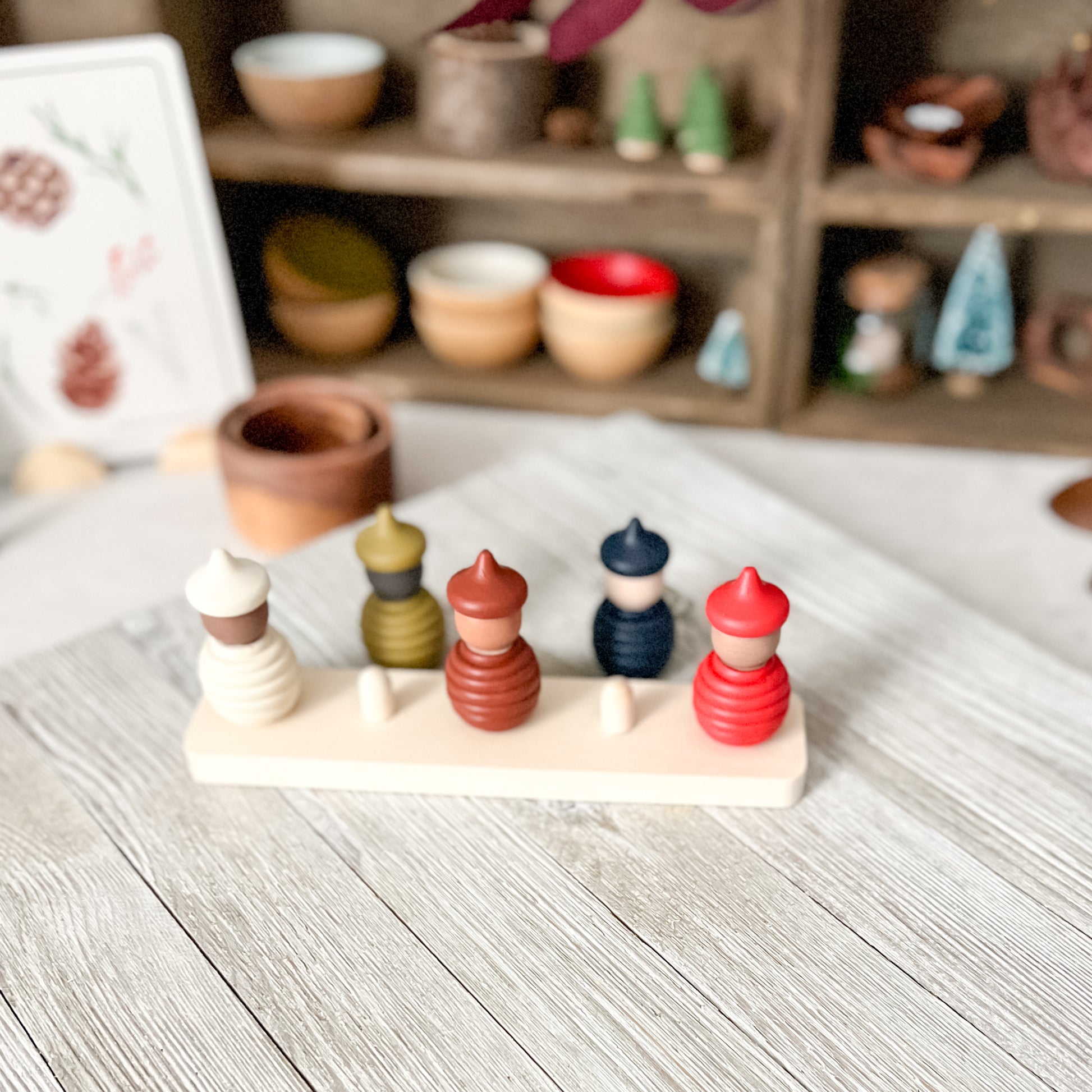 Meet the Winter Cheer Acorn Friends—a delightful return of everyone's favorite wooden companions, now dressed in cozy seasonal hues. This charming set features diverse skintones celebrating inclusion and representation in imaginative play. Each acorn friend slots securely onto the included pegged stand, inviting little ones to explore sorting, stacking, and creative storytelling. Perfect for developing fine motor skills while spreading winter warmth and joy through hands-on, screen-free play.