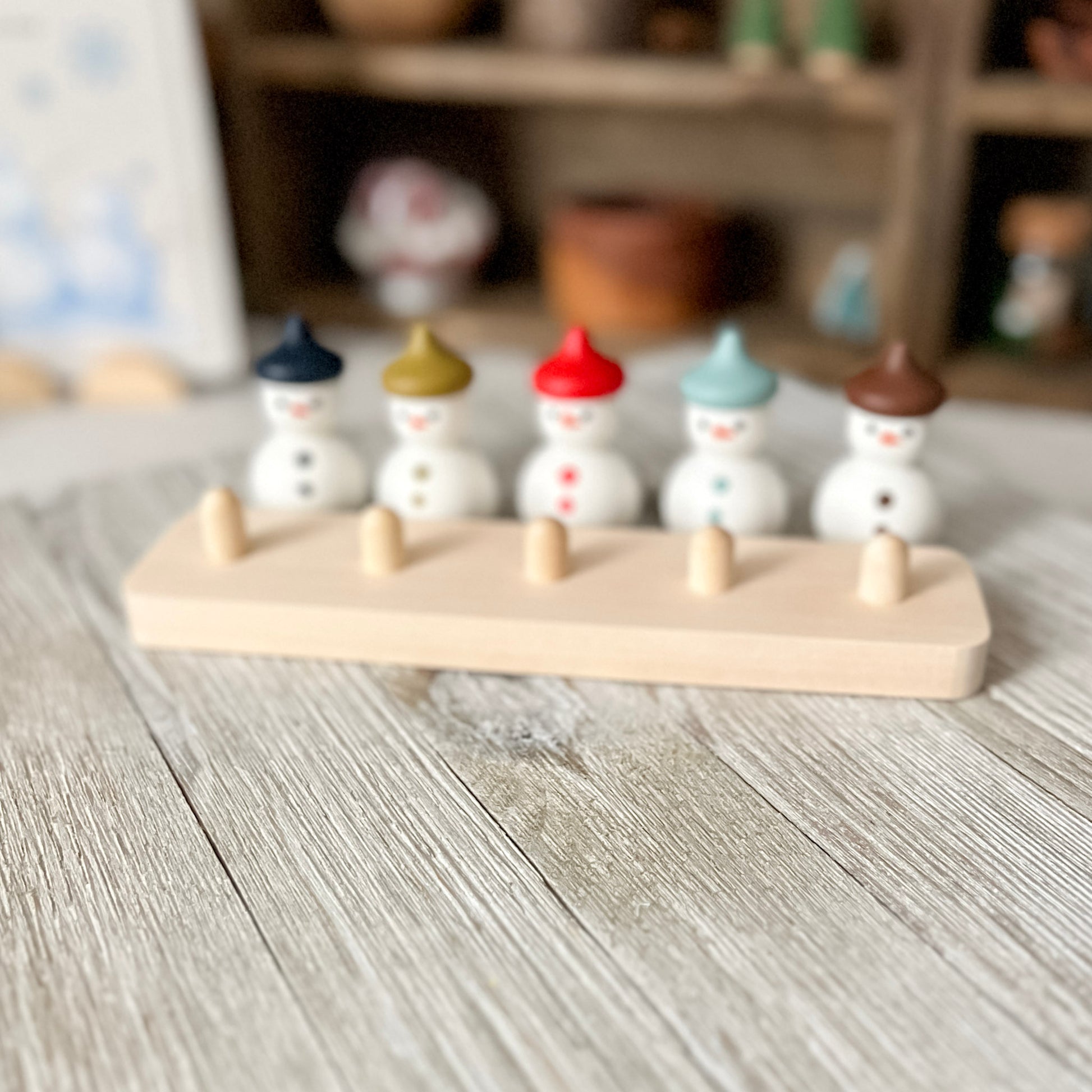 Winter Cheer Snowmen Friends bring festive fun to playtime with their cheerful holiday palette. This limited-edition set features charming wooden snowmen in classic winter colors, perfect for imaginative stacking and sorting adventures. Each piece slots securely onto the included wooden pegged stand, encouraging hands-on learning through creative play. Ideal for young builders seeking seasonal joy and developmental skill-building in one delightful package.