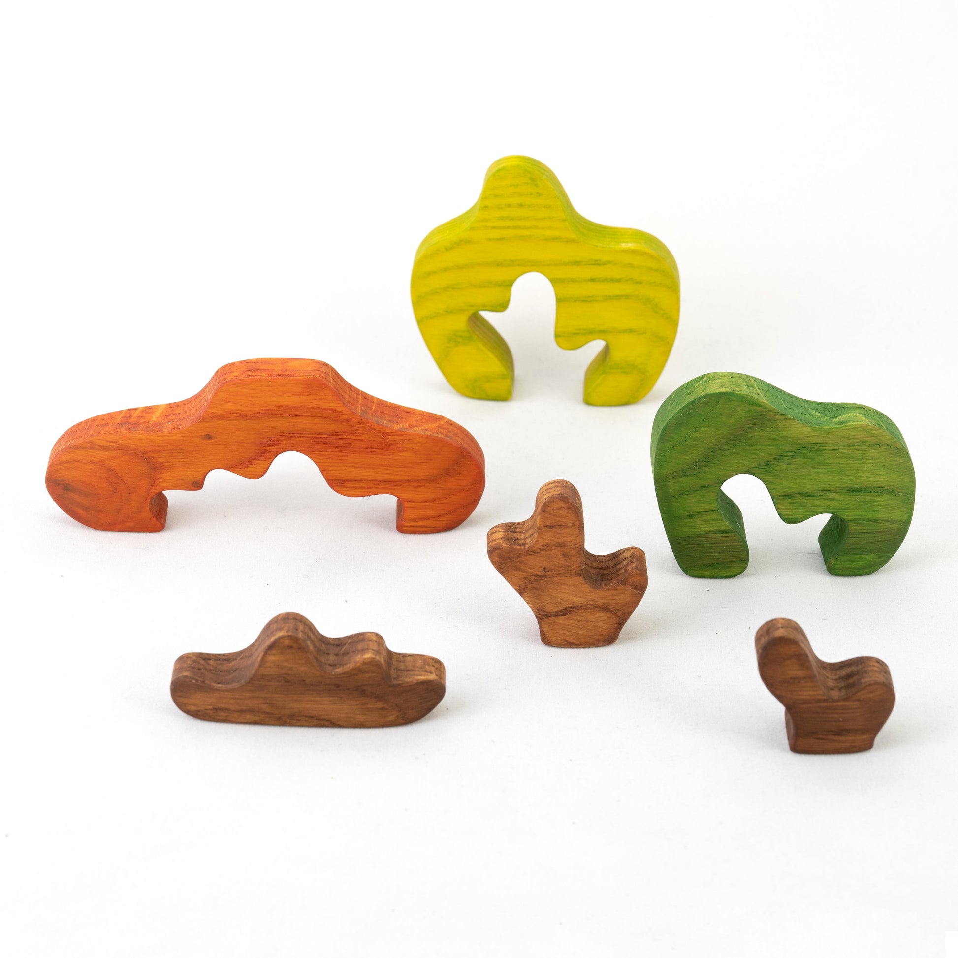 While playing with natural wooden toys children touch and feel natural materials and as a result improve tactility and fine motor skills. It promotes creativity, imagination. social and emotional skills. Improving visual-spatial reasoning, problem-solving skills, attention to details. Increase productivity and creative thinking ability.