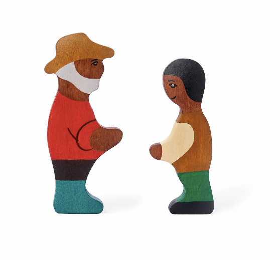 Waldorf Wooden African American Family set includes a grandmother, a grandfather, mother, father, older son, older daughter, younger son , younger daughter and a baby. This family set could be a great addition to any playset for more creative and imaginative play. It is hand-carved and painted by hand.