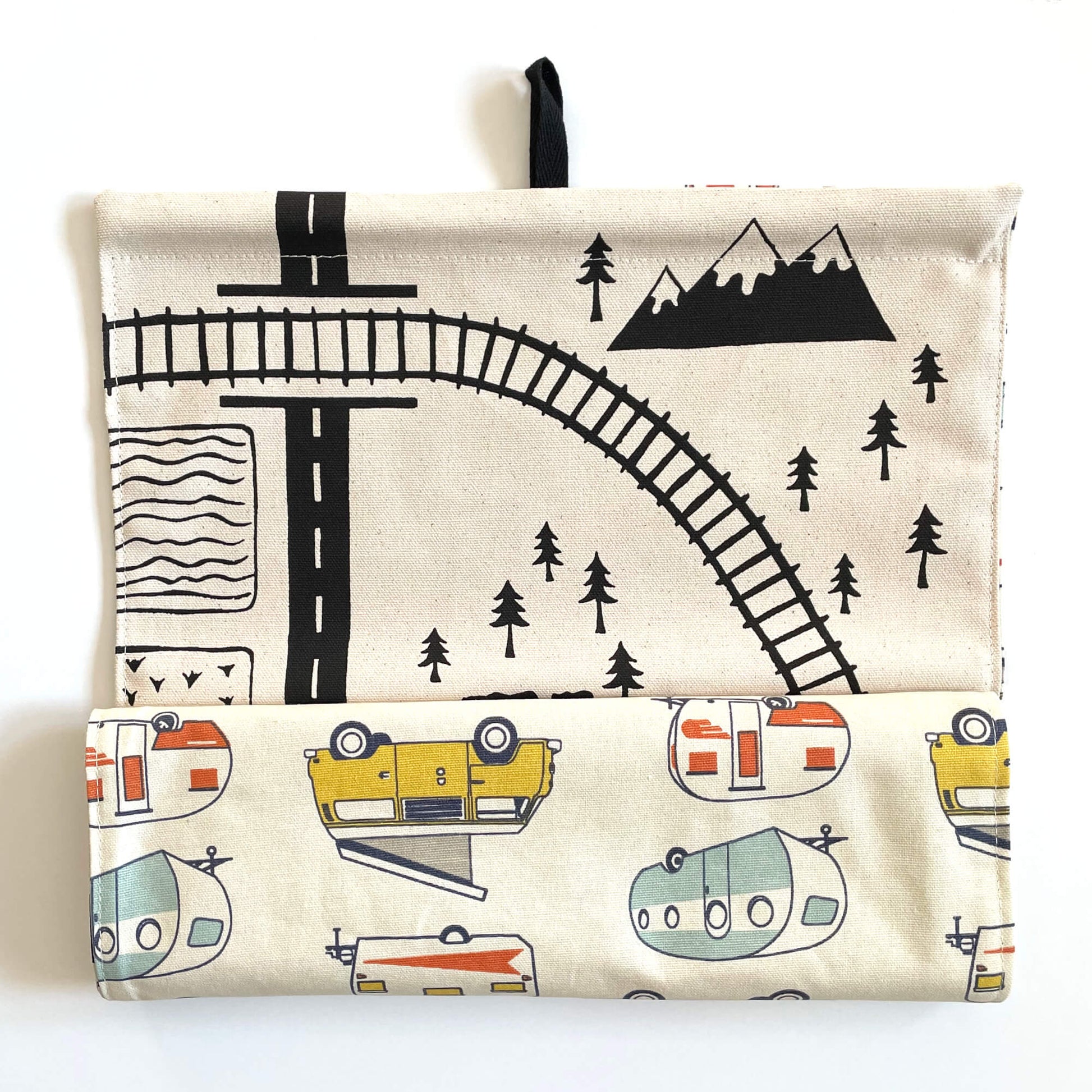 With this play mat roads a whole world unfolds before your child’s eyes with this large, rollable play mat. With its illustrated train tracks, roads, trees, mountains, campsites, and fields, children can use this for road play and imaginative play on the go or at home