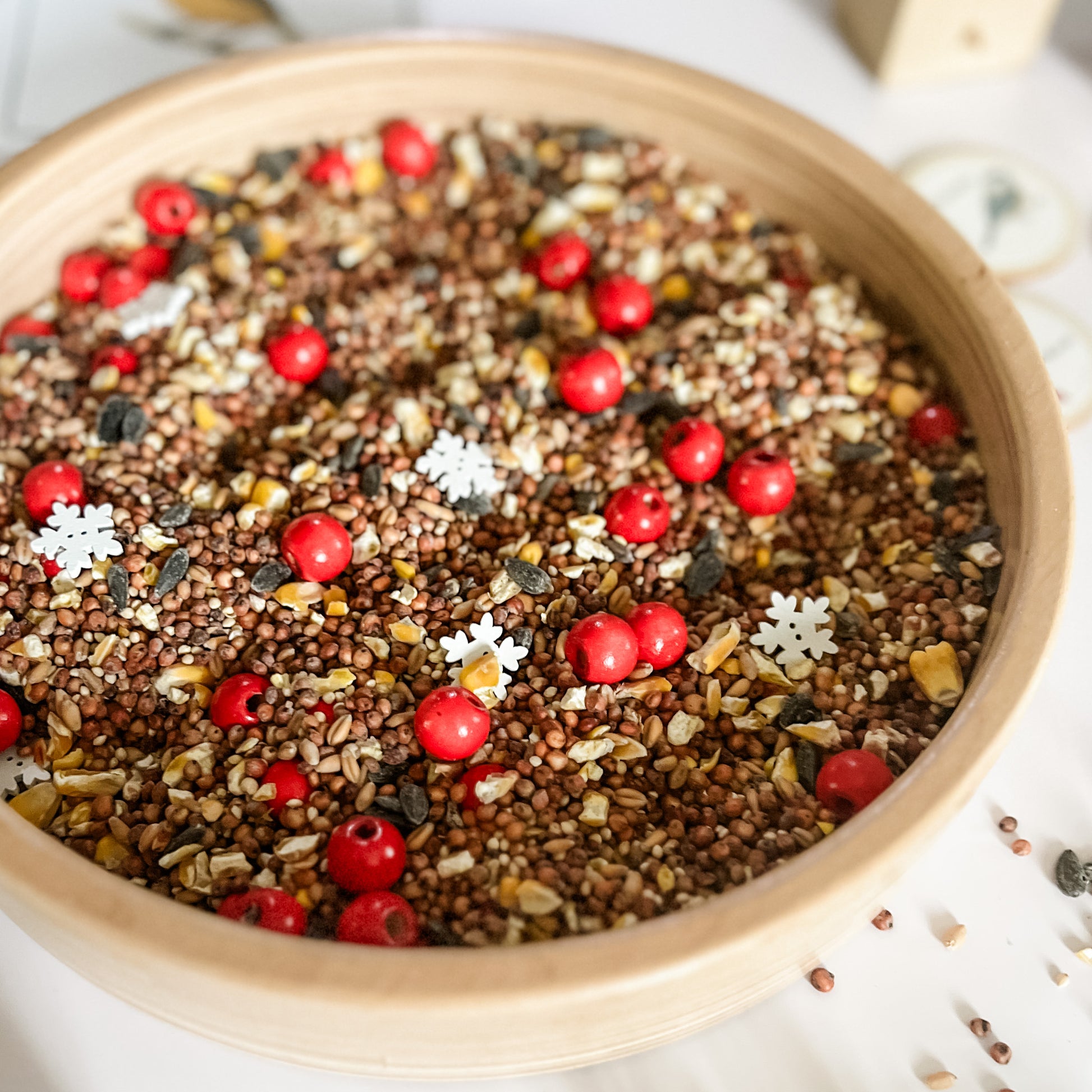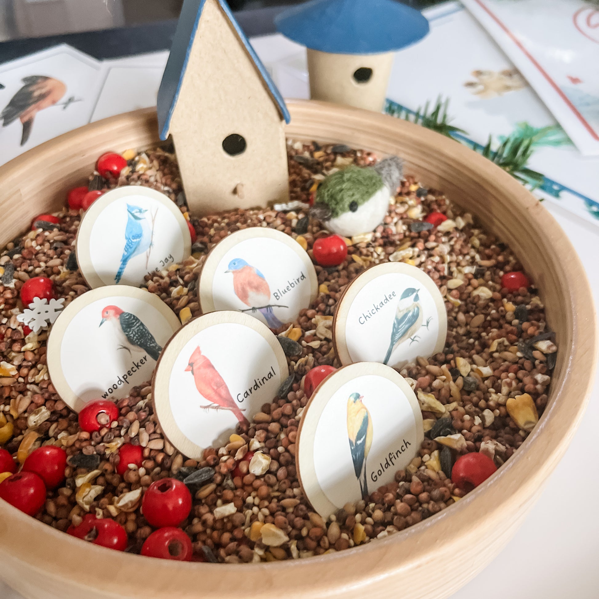 What's included - A Winter Bird themed sensory bin ready for play, learning, and activities. January's bin filler is a mix of birdseed, wooden snowflakes, and wooden beads. Included is a Mini Eco Plastic Tray in the shape of a birdfeeder, Cardinal wooden counters, winter bird picture tokens, a wool wool felt winter bird, and a wooden owl spoon.