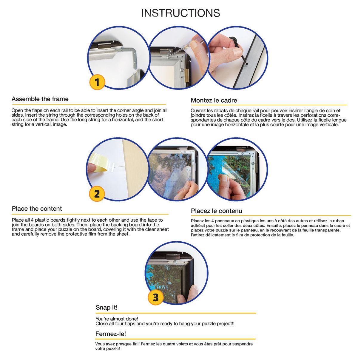 - Insert puzzle, remove the protective film from clear covers and place over the puzzle, snap all four sides closed and puzzle is ready to display.