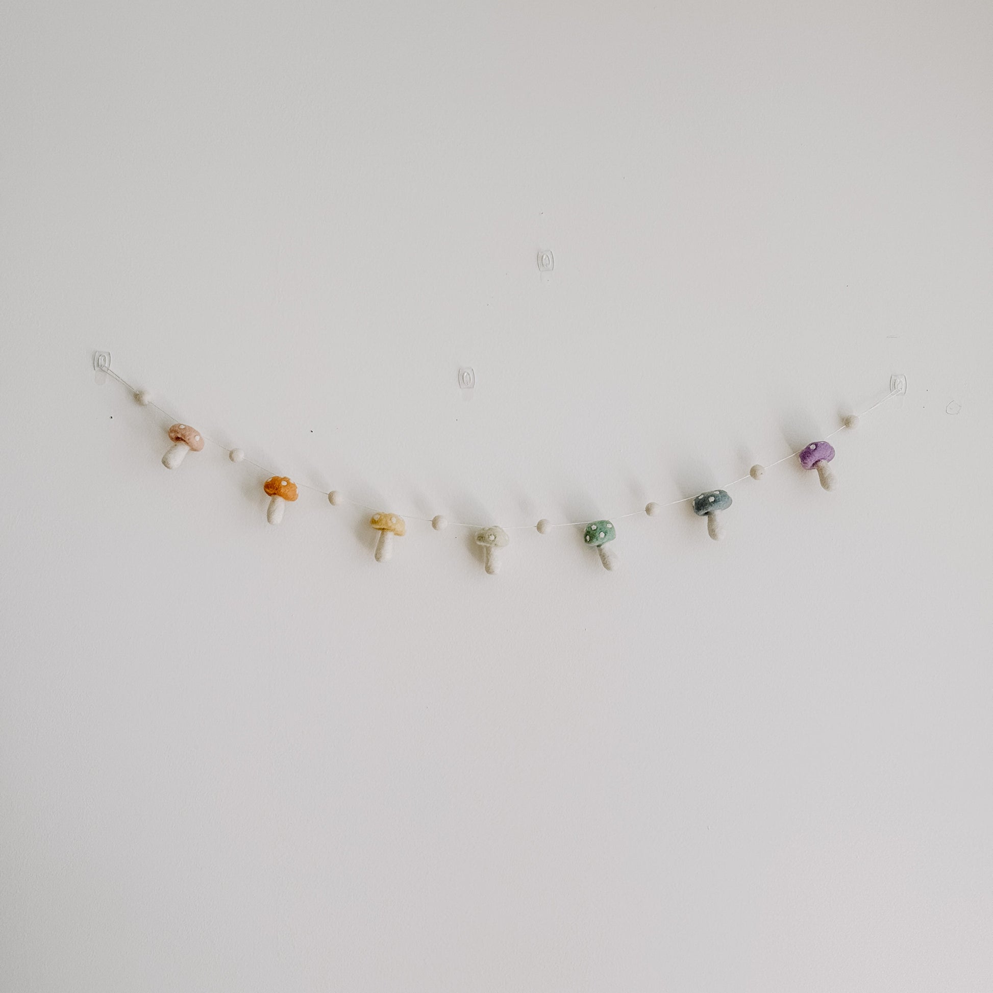 Bring a touch of enchanted forest magic to your space with this 4-foot Pastel Mushroom Garland! Featuring soft, handcrafted wool felt toadstools in gentle rainbow hues—blush, honey, mint, lilac, and more—this garland is perfect for nurseries, playrooms, or woodland-themed parties.