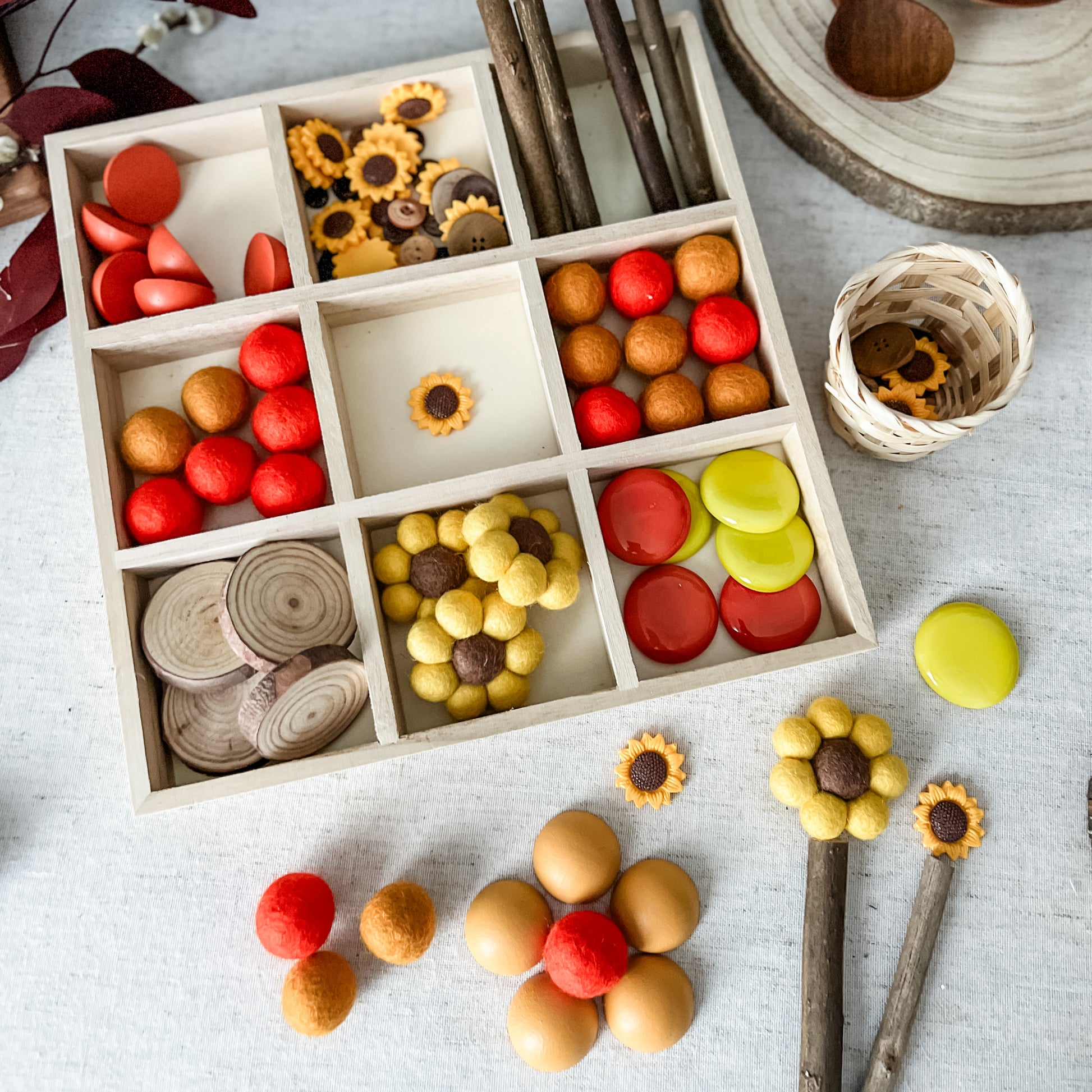 Unleash your child's creativity with our Large Sunflower Tinker Tray! This 12 inch wooden tray is filled with yellow and orange loose parts, perfect for sensory play, tinkering, and open-ended imaginative play. With gems, felt, natural elements, and more, the possibilities for play are endless!