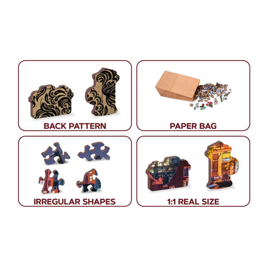 Each puzzle contains numerous unique shapes, characters, figures, and symbols that are cut seamlessly into the pattern. Think of these as mysterious little surprises each puzzle experience offers. These puzzles offer a high quality, rich beautiful image on the front and a detailed wallpaper style pattern on the back. Wooden City double-sided wooden puzzles offer a unique building experience that is sure to captivate puzzle enthusiasts of all ages.