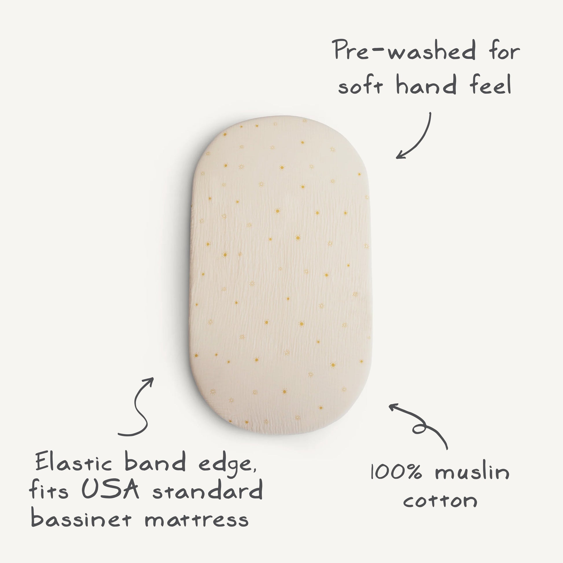 Made from 100% muslin cotton, our cozy, extra soft bassinet crib sheet is pre-washed for lasting softness against your baby’s delicate skin. Muslin fabric stays naturally breathable while keeping your little one warm, comfortable, and cuddly. Sized to fit most standard USA bassinets, this sheet works best with oval, hourglass, and rectangular mattresses for a perfect fit.
