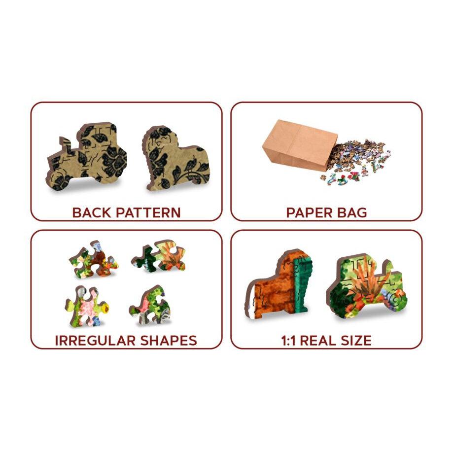 Each puzzle contains numerous unique shapes, characters, figures, and symbols that are cut seamlessly into the pattern. Think of these as mysterious little surprises each puzzle experience offers. These puzzles offer a high quality, rich beautiful image on the front and a detailed wallpaper style pattern on the back. Wooden City double-sided wooden puzzles offer a unique building experience that is sure to captivate puzzle enthusiasts of all ages.