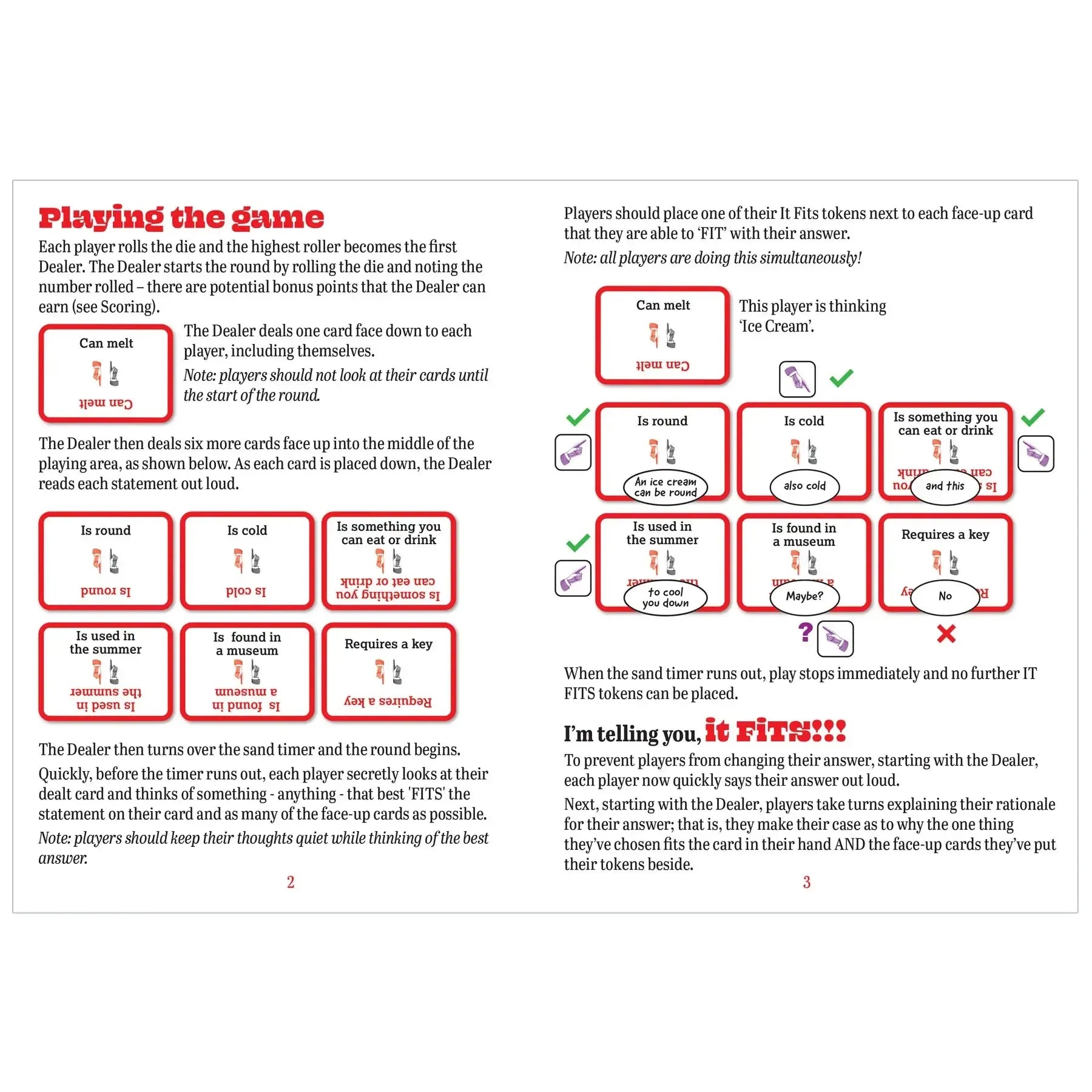 It Fits is a party game of dreaming up connections. Each player is given a card with a statement like "Fits in a blender". Then six more cards are placed face up. The goal is to dream up something that fits your card and as many face-up cards as possible, and then make your case to the other players.