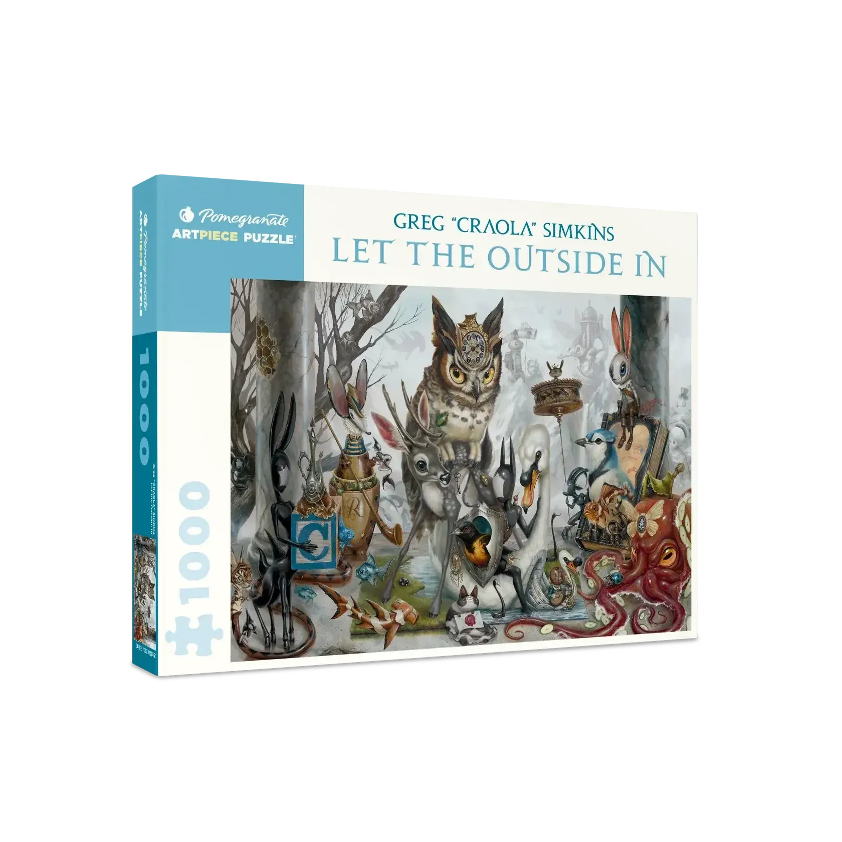Surrealist painter Greg “CRAOLA” Simkins has made a name for himself with the fantastical realm that he calls the Outside—a world full of heroes, villains, artifacts, and whimsy. Simkins began drawing at the age of three, finding inspiration in the animals he grew up with and the books and cartoons he enjoyed, especially Watership Down and The Chronicles of Narnia. At 18, he began experimenting with graffiti under the name “CRAOLA,” and these experiences led him to the world of acrylics. With this 1000-piece puzzle, embrace the peculiar as you immerse yourself in the Outside.