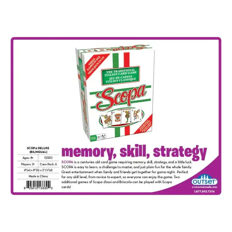 Italian Scopa is a centuries old card game requiring memory, skill, strategy and a little luck. Scopa is easy to learn, a challenge to master, and just plain fun for the whole family. Great entertainment when family and friends get together for game night. Perfect for any skill level, from novice to expert, so everyone can enjoy the game. Two additional games of Scopa d'assi and Briscola can be played with Scopa cards! See instructions tab below for more details. Bilingual: English and French.