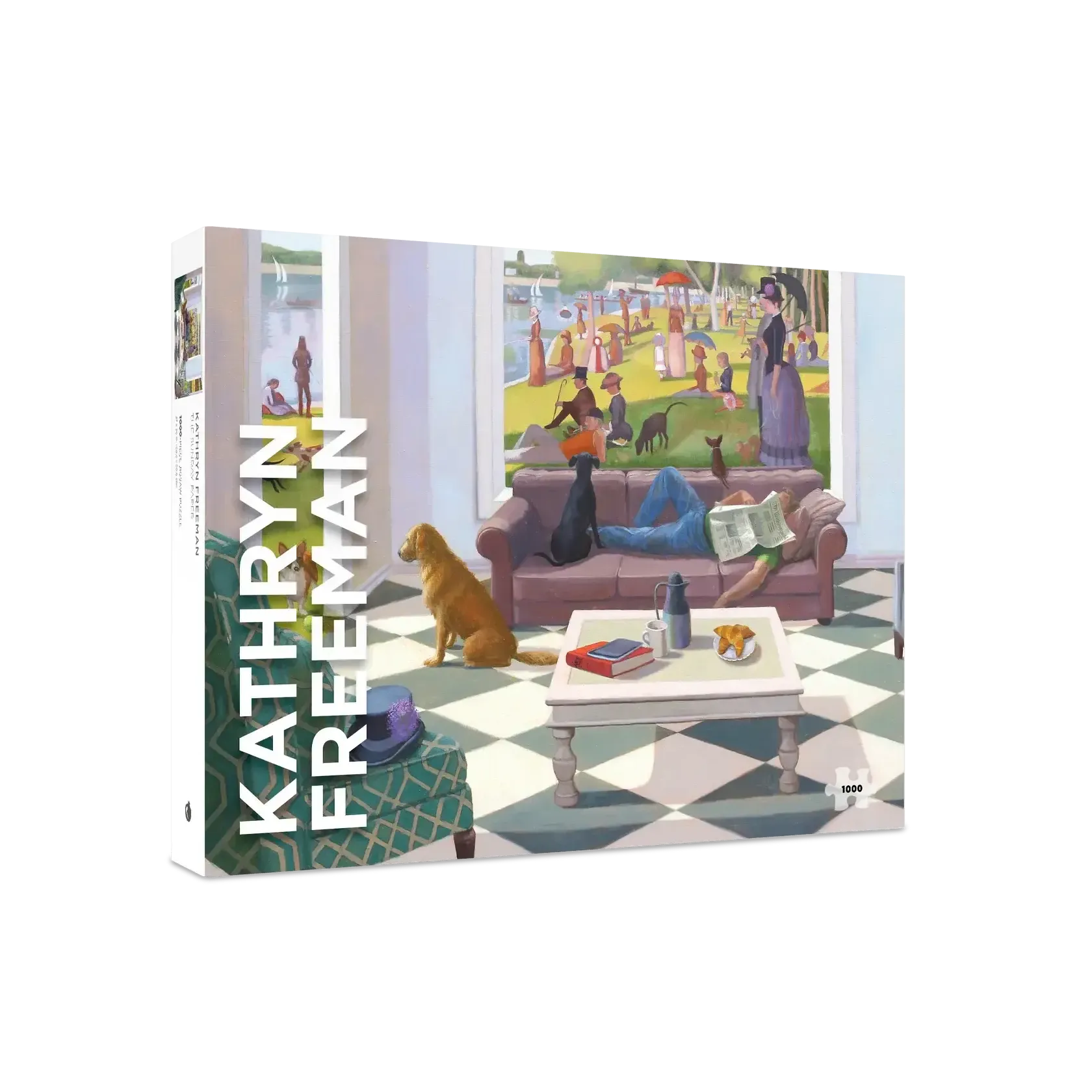 Kathryn Freeman applies her unique perspective to this iconic work of pointillism with a playful blending of modern and classic. Freeman credits Georges Seurat’s A Sunday on La Grande Jatte as a major influence on her painting development, and it's an image she returns to repeatedly for inspiration. Elements of this much admired masterpiece seep into Freeman's modern living room filled with loyal dogs, coffee, and a long read of the weekly paper. Sunday, after all, is fun day.