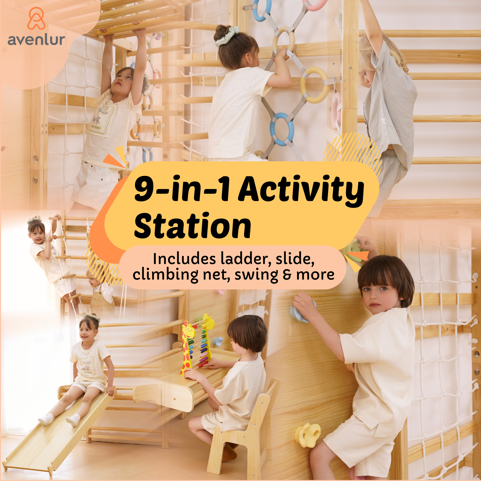 • 🧗 9-in-1 Activity Station – Includes ladder, slide, climbing net, swing & more