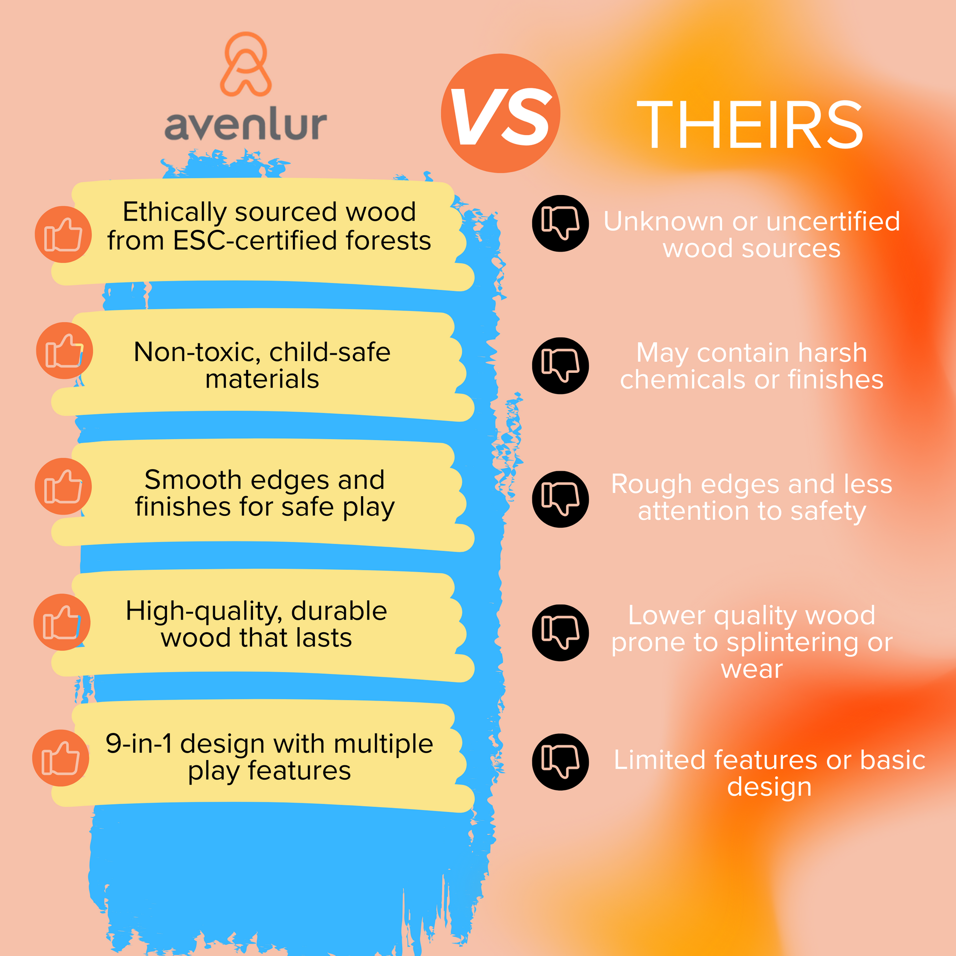 At Avenlur, we specialize in designing Montessori-inspired, safe, and sustainable indoor play equipment that blends beautifully into your home. Compared to plastic or metal alternatives, our products: