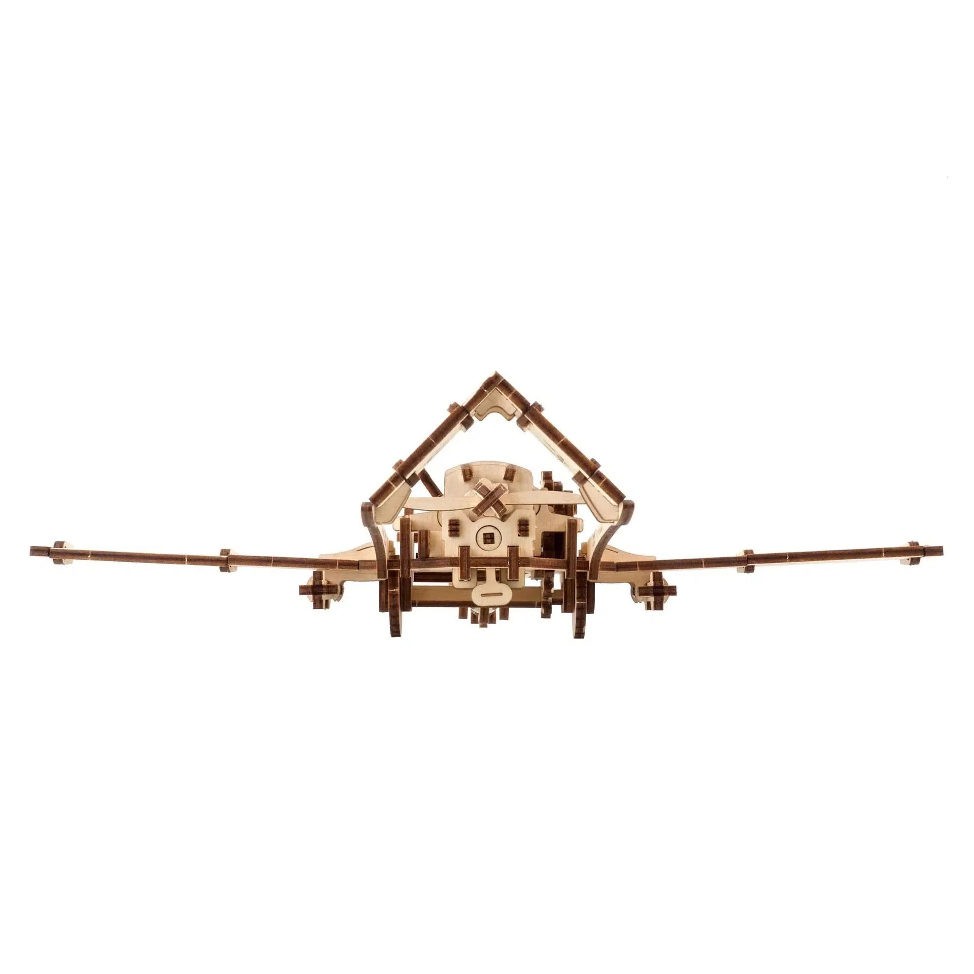 After many requests from our fans, and to honor Ukraine's armed forces, Ugears is proud to introduce the Bayraktar TB2 combat drone wooden model. The Bayraktar TB2 combat drone model has movable rudders on the inverted V-tail structure, moveable wing ailerons, a moving surveillance camera under the body, and detachable missiles under the wings. The Bayraktar TB2 combat drone makes a buzzing sound when in operation, adding to the realism of this DIY wooden drone model. The model has a built-in ratchet key to wind the spring motor, which transmits power and rotation to the wheels and spinning push propeller. A start/stop lever on the side of the drone allows you to control the drone's movement. To operate, just give the winding key about 6 complete turns, place the model on the floor or other flat surface, flip the start lever to the upper position, and watch as your wooden UAV model taxis down the runway, ready to take off on its next secret mission.