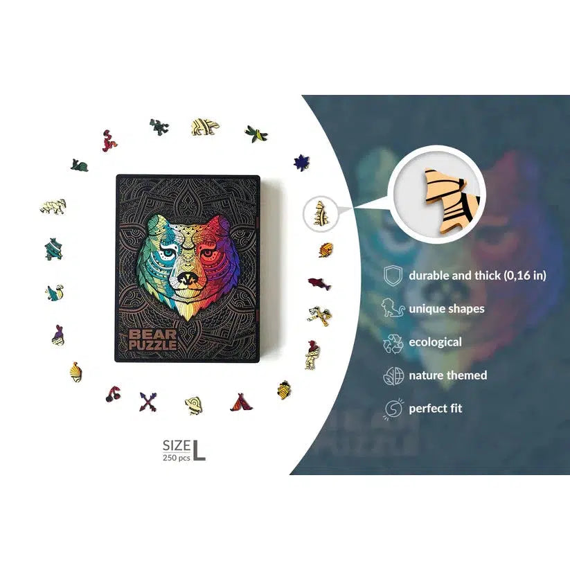 The Jigsaw Pieces Large Puzzle - Bear Shaped is a unique and challenging puzzle that is perfect for people of all ages. The puzzle consists of 250 irregular wooden pieces that are shaped like a bear.
