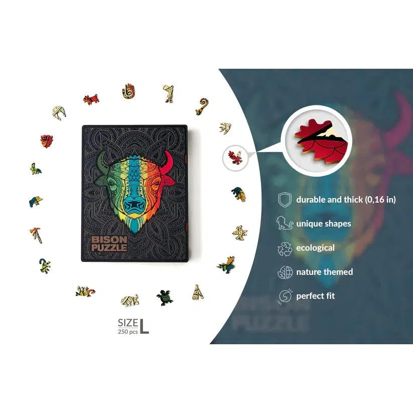 The Bison Shaped Jigsaw Piecezz Puzzle is a unique and challenging puzzle that is perfect for people of all ages. The puzzle consists of 250 irregular wooden pieces that are shaped like a bison.