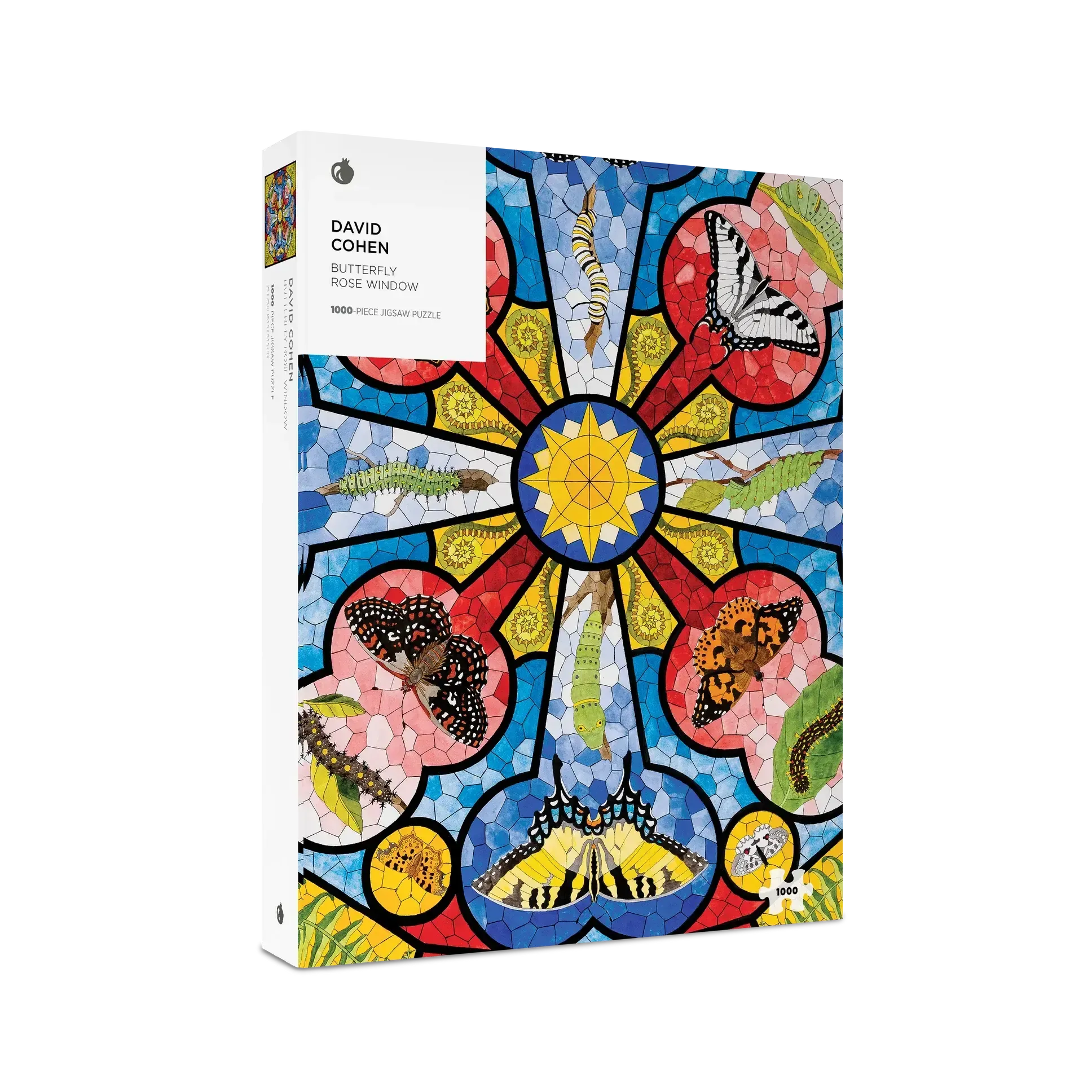 Like a butterfly emerging from its chrysalis, the art of David Cohen bursts with color and natural pattern. Mimicking stained-glass and glowing like a backlit window, this piece features 16 varieties of butterflies, all listed on the assembly insert inside this box. Each butterfly is magical in its own way; their wings are unique, which makes assembling this 1000-piece puzzle a meditation in detail.