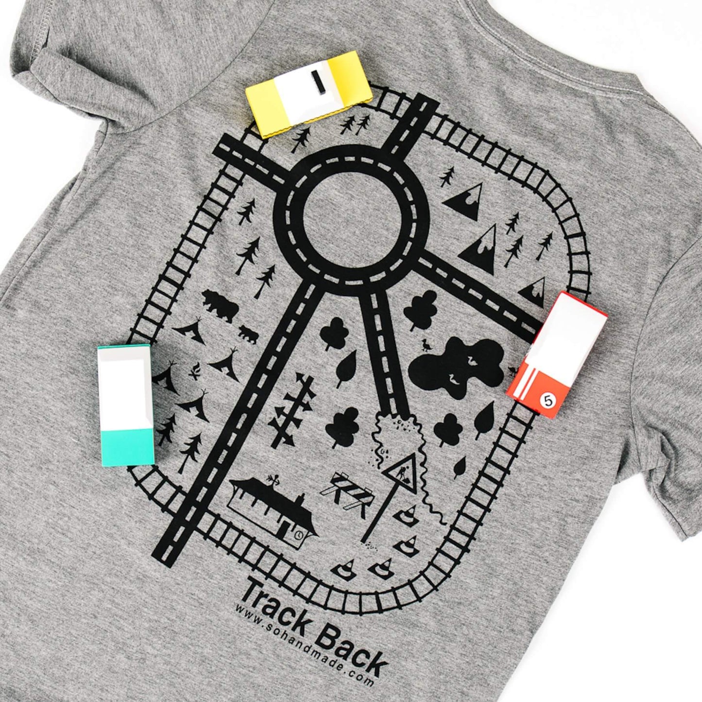 With this Car Play Mat T Shirt you can play with your favorite car on dad's back! The track patterned gray t shirt has a play mat printed on the back allowing parents to lie on their stomach while the little ones drive, chug and zoom all over their back. The car dad t shirt is the perfect gift for a father's day gift or dad's birthday.