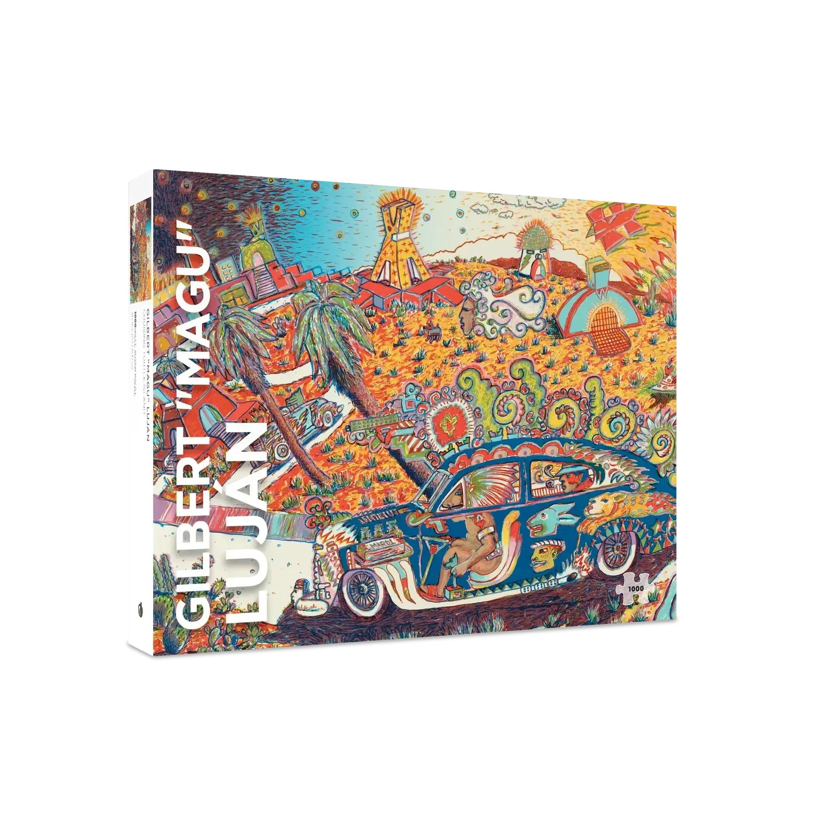 Cruising Turtle Island pumps out an L.A. funk beat, heavy on the bass. Boasting anthropomorphic dogs, ancient monuments, and a lowrider with an Aztec warrior at the wheel, cultural identity is the artwork’s driving force. Visionary painter Gilbert “Magu” Luján proudly proclaimed his Mexican and Native American heritage as he developed his colorful vocabulary for Chicano art. Turtle Island itself, a resonant reference to North America, originated in Indigenous creation stories. Luján, who founded the influential artists’ collective Los Four, celebrates the rhythm of life in this joyful utopia of Chicanismo.