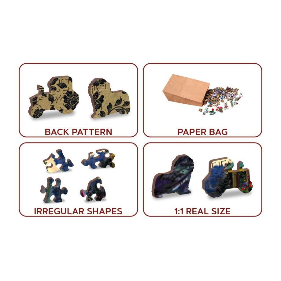 Each puzzle contains numerous unique shapes, characters, figures, and symbols that are cut seamlessly into the pattern. Think of these as mysterious little surprises each puzzle experience offers. These puzzles offer a high quality, rich beautiful image on the front and a detailed wallpaper style pattern on the back. Wooden City double-sided wooden puzzles offer a unique building experience that is sure to captivate puzzle enthusiasts of all ages.