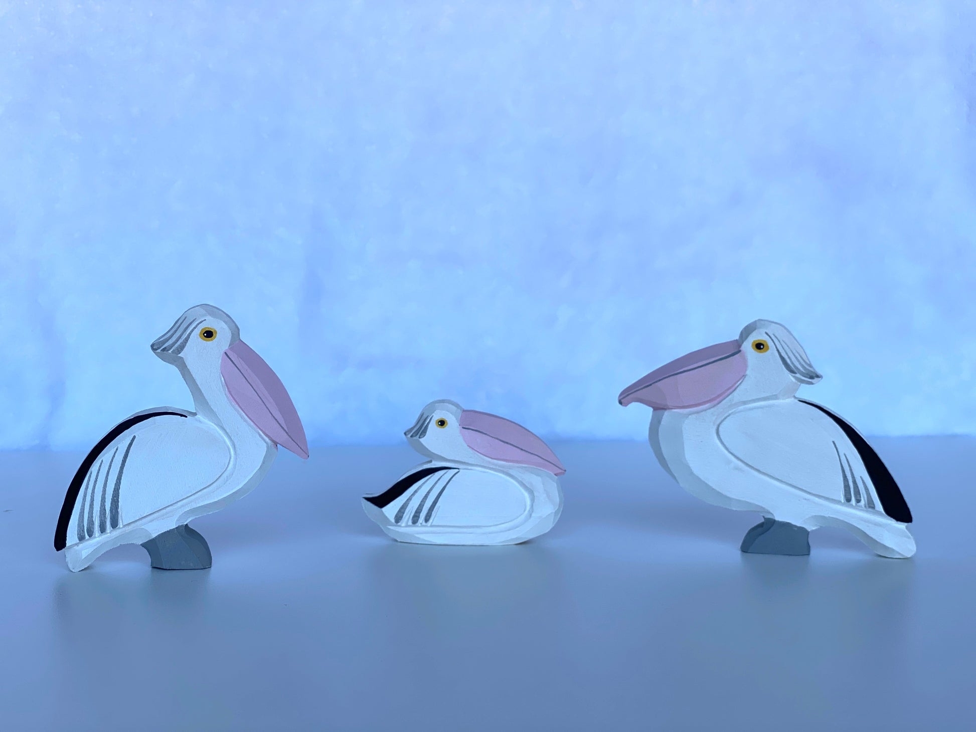 These wooden pelican figurines are hand-carved and hand-painted with such amazing attention to detail and make perfect wooden pelican figurines to play with. The set comes with 3 wooden pelican figurines: Male, Female, and Baby. This is a great addition to so many of our other figurine sets and individual pieces. This is a great set for interactive play. Combine with many of our trees, ponds, other animals, and many other sets and individual pieces, there is no limit to the creative ways that your little one can play with these beautiful hand-carved pelican figurines.