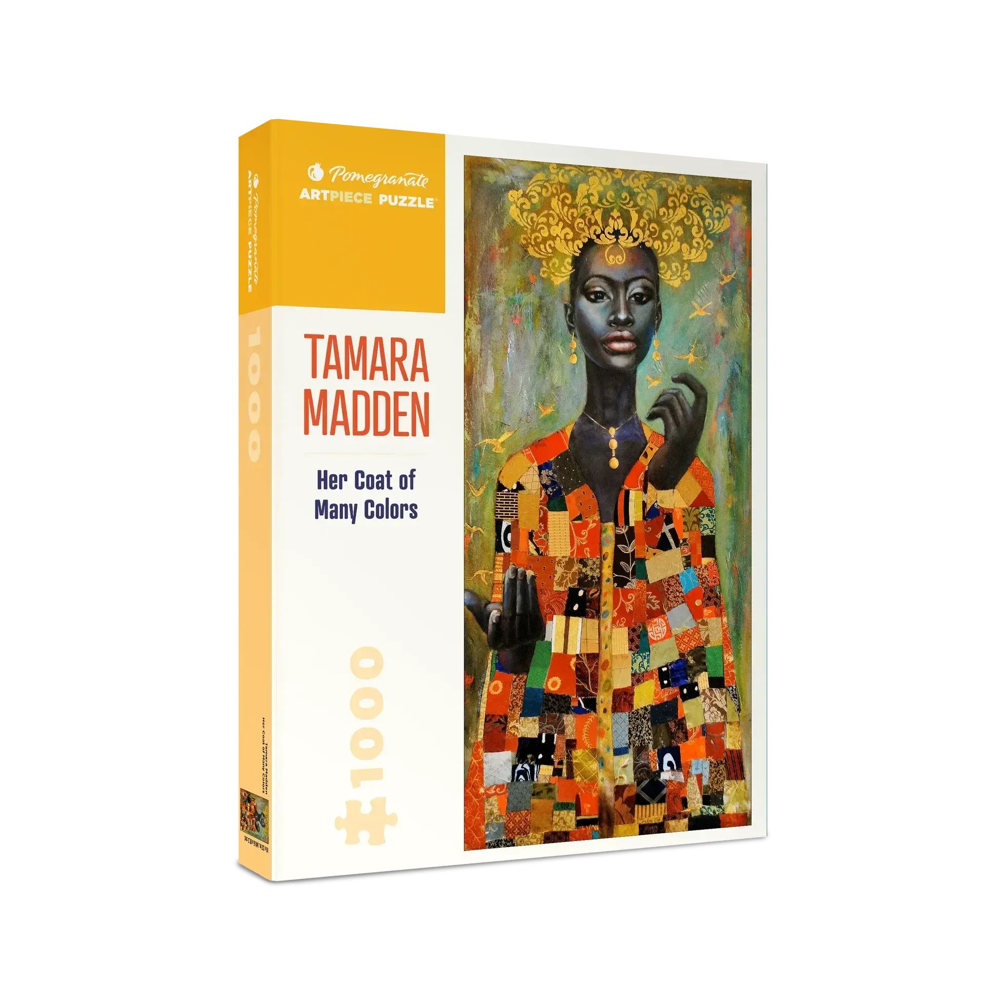 Tamara Madden was renowned for featuring Black women of the African diaspora in elaborate headdresses and lavish ensembles, and Her Coat of Many Colours is no exception. Madden’s mixed media technique brings this artwork to life: her use of muted colors in the background allows the different elements of the patchwork coat to dazzle the eye and the intricate details of the headdress to captivate. Take in Madden’s regal imagery as you assemble this 1000-piece puzzle.