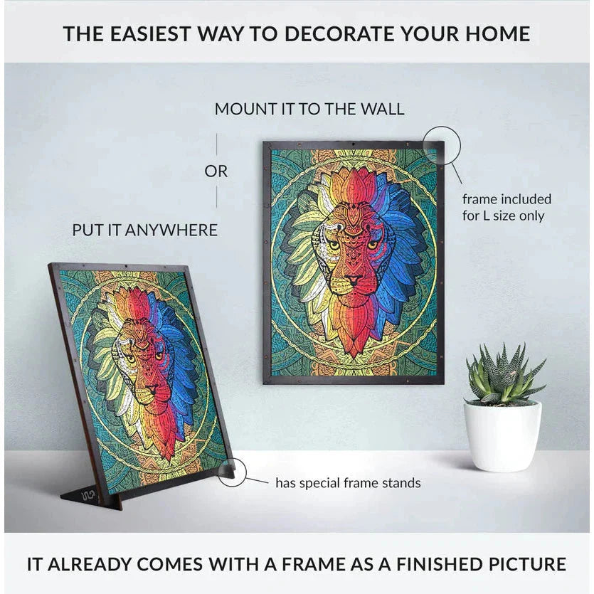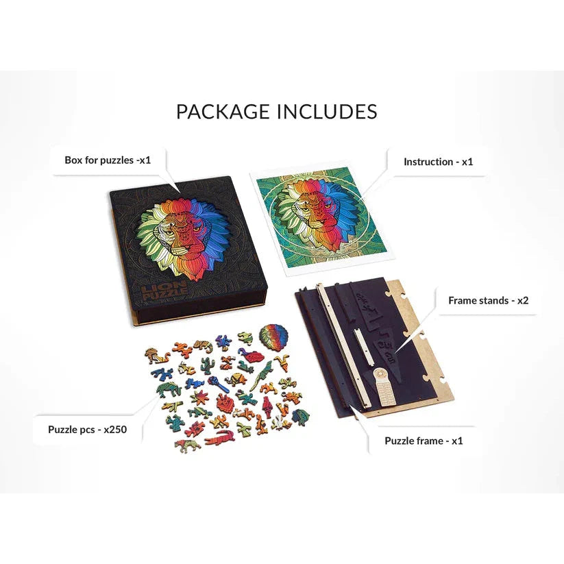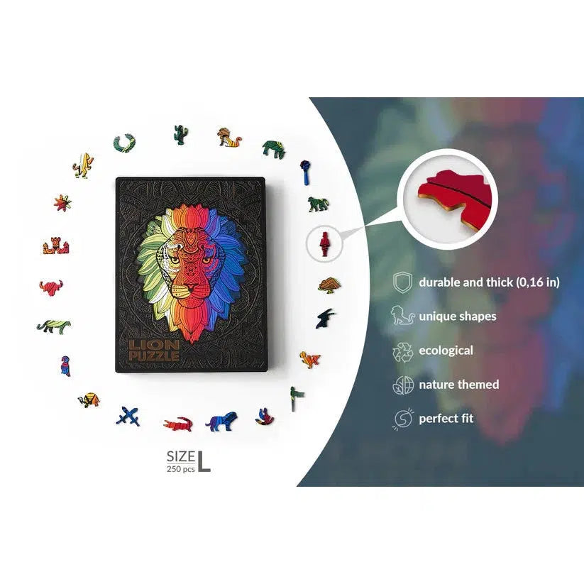 The Lion wooden puzzle is a large size challenging puzzle that is perfect for noble leaders who are always ready for a challenge and not afraid to take risks. The puzzle features 250 large size, irregularly shaped pieces that are precision-cut from high-quality wooden pieces puzzle. The jigsaw pieces is shaped like a lion, making it a fun and educational puzzle for children and adults alike.