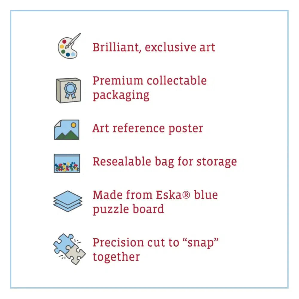 Boardwalk traditional puzzles are proudly manufactured in the U.S.A. from domestic and imported materials. Our jigsaw puzzles are made with premium Eska® puzzle blue board produced from 100% recovered paper. Each puzzle comes in a collectable box with magnet close, includes a full-color reference poster, and contains resealable bag for puzzle storage. Boardwalk traditional puzzles are precision cut to fit tightly and “snap” together.