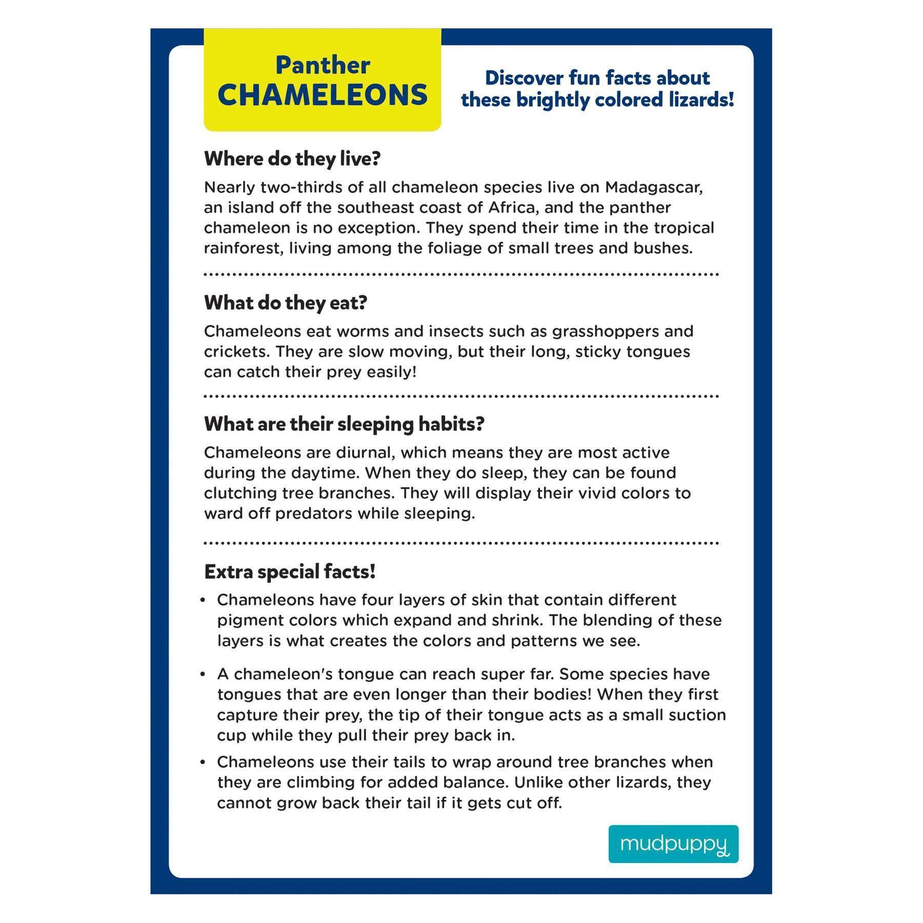 Panther Chameleon Mini Puzzle from Mudpuppy is a small size puzzle featuring a realistic image of a Panther Chameleon in its natural habitat. The 48 piece finished puzzle measures 8 x 5.75" so it’s perfect for train or airline tray tables. A two-sided insert includes an image of the puzzle on one side and fun facts about the Panther Chameleon on the other!