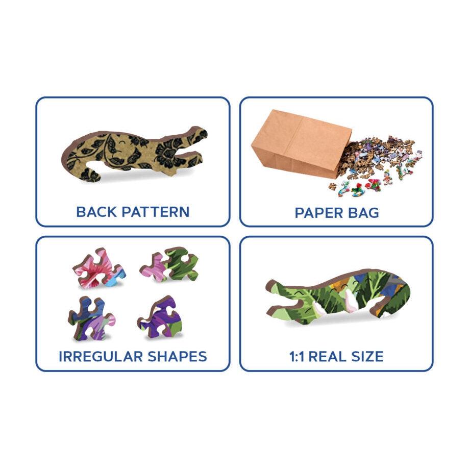 Each puzzle contains numerous unique shapes, characters, figures, and symbols that are cut seamlessly into the pattern. Think of these as mysterious little surprises each puzzle experience offers. These puzzles offer a high quality, rich beautiful image on the front and a detailed wallpaper style pattern on the back. Wooden City double-sided wooden puzzles offer a unique building experience that is sure to captivate puzzle enthusiasts of all ages.