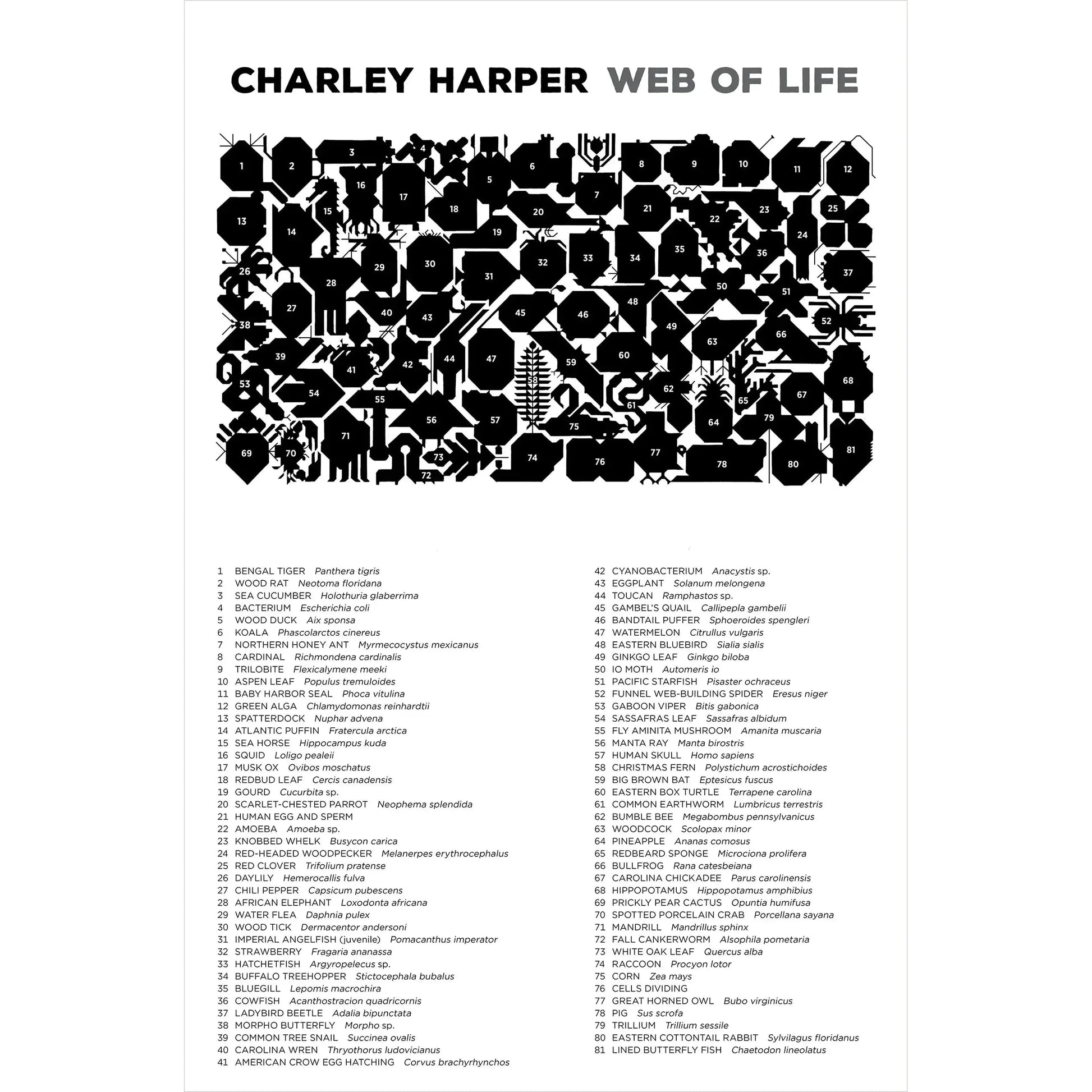 Charley Harper (American, 1922–2007) Web of Life, 1986 From cardinal to chili pepper, cowfish to cyanobacterium, Charley Harper’s Web of Life brings together 81 interconnected life-forms in a colorful homage to the biological sciences. Worked in his signature minimal realism style, this celebrated ceramic tile mural is showcased within Pearson Hall, a sciences hub on the campus of Miami University, Oxford, Ohio. Harper, a wildlife artist as well as a lifelong naturalist and conservationist, said, “I regard the picture as an ecosystem in which all the elements are interrelated, interdependent, perfectly balanced . . . in a world of chaos, the picture is one small rectangle in which the artist can create an ordered universe.” Harper’s entire mural, made of thousands of small tile squares, is reproduced on the included key. All of the identified species are depicted on this delightfully challenging 2000-piece jigsaw puzzle.
